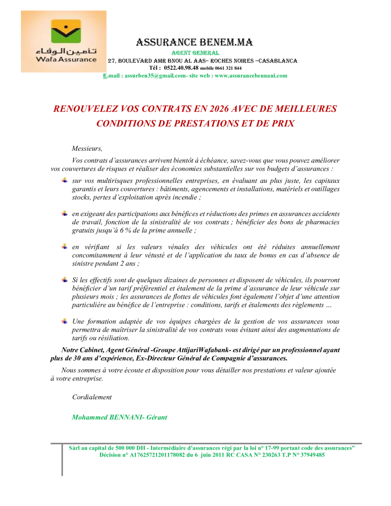 – Agent Général de WAFA ASSURANCE, le Cabinet a été fondé en 2001 par Mohamed BENNANI, ex – DGA de Compagnie d’Assurances.